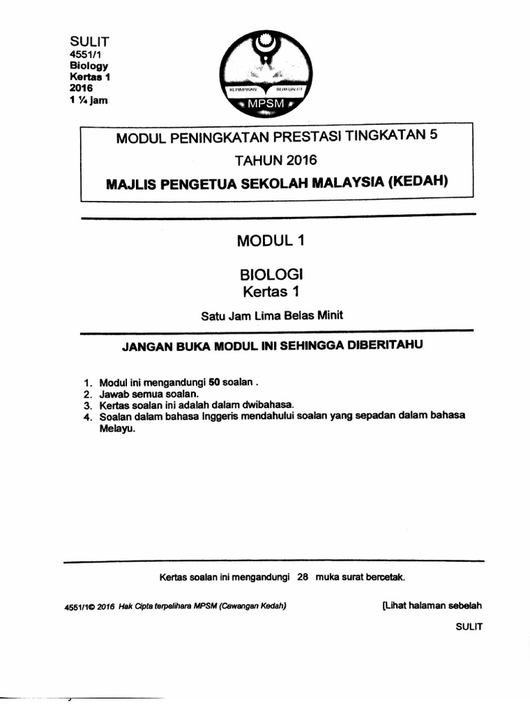 2016 Percubaan Spm Kedah Biologi Kertas 1