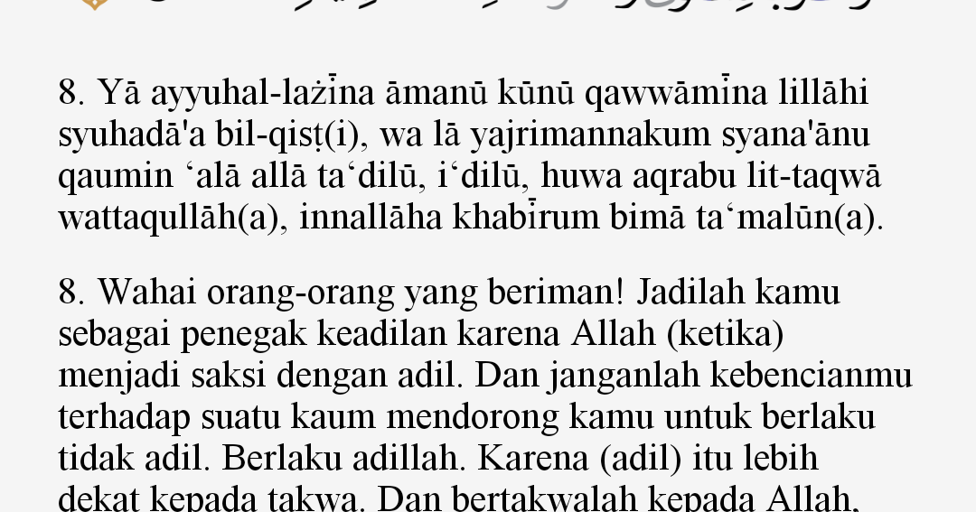 Surat Al Maidah Ayat 8 Latin Serta Arti Perkata Dan Isi Kandungannya
