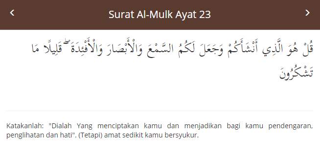 Dialah yang menciptakan kamu dan menjadikan bagi kamu pendengaran penglihatan dan hati. Ayat ini memerintahkan kepada nabi muhammad dan seluruh manusi. Surah al mulk kerajaan surah ke 67.