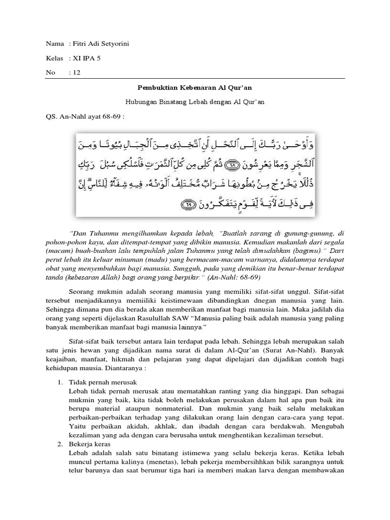 Dan sesungguhnya pada ciptaan yang unik itu terdapat pertanda akan wujud sang pencipta yang mahakuasa lagi mahabijaksana. Terjemahan al quran bahasa melayu. Lebah adalah makhluk allah yang banyak memberi manfaat dan kenikmatan kepada manusia.